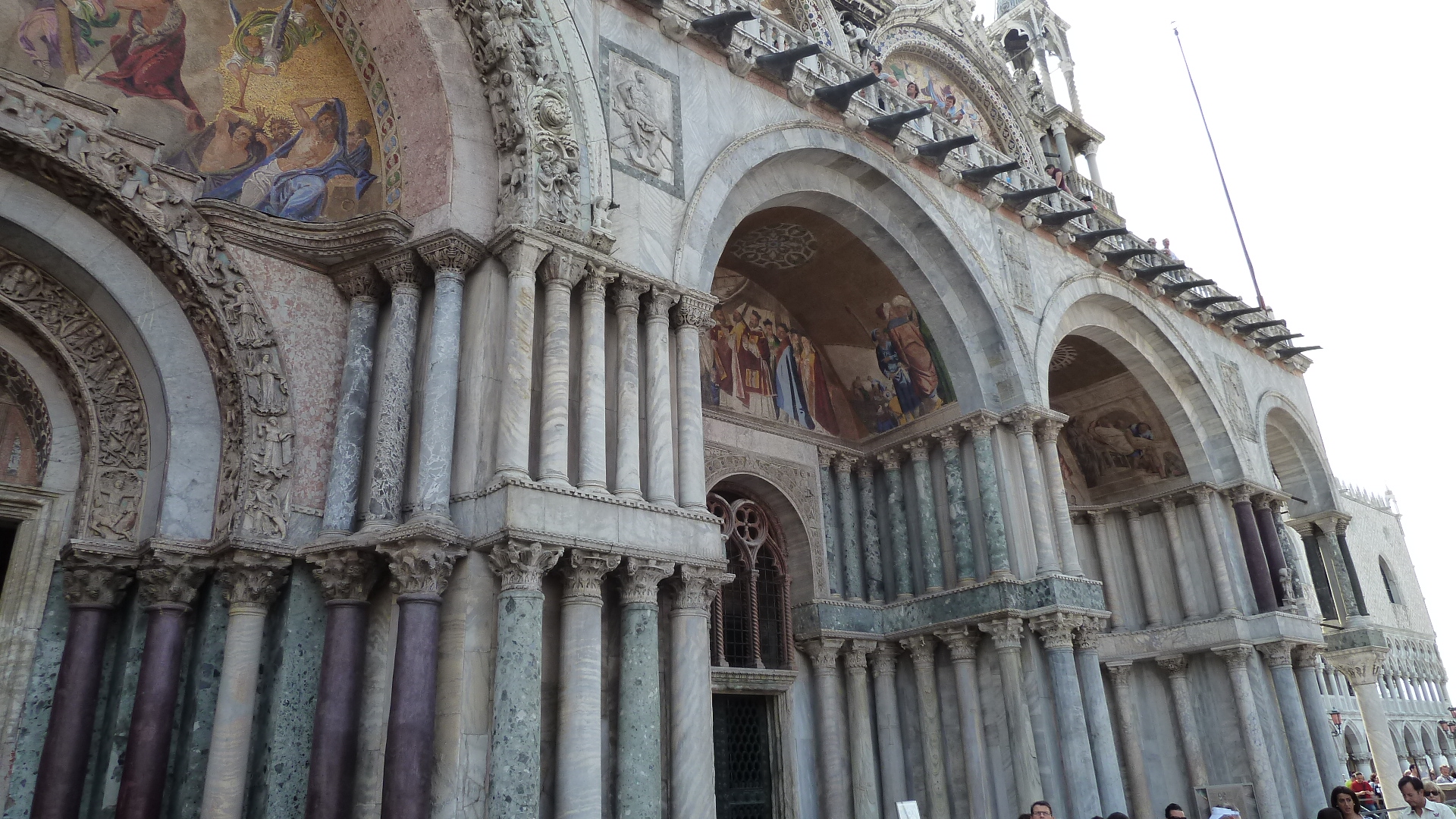 ここサンマルコ広場は海岸のため建物は塩害に悩まされます。特に冬場の満潮時にはアクア・アルタといって広場全体が海水に浸る時があります。当然教会の宗教壁画も損傷が発生します。当時のヨーロッパの教会では一般的な、着色した漆喰で描かれるフレスコ画は塩害には弱いのです。