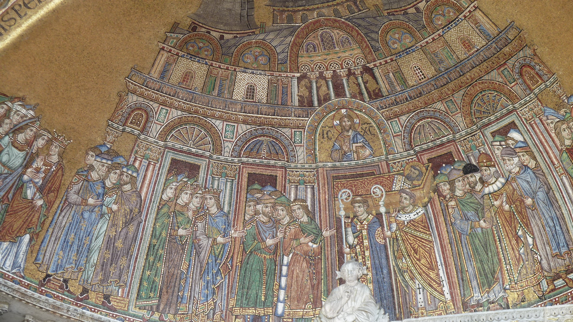 当時は聖都エルサレムをイスラムから奪還するため、ときのローマ法王は[神はそれを望んでおられる]との名目で聖都奪還に十字軍を派遣しておりました。その軍団一行を中東に輸送するためにヴェネチアの海運が積極的に関与していたそうです。超経済大国であり、そして十字軍への援助を惜しまないヴェネチアにローマ法王は一目置いていたと考えます。