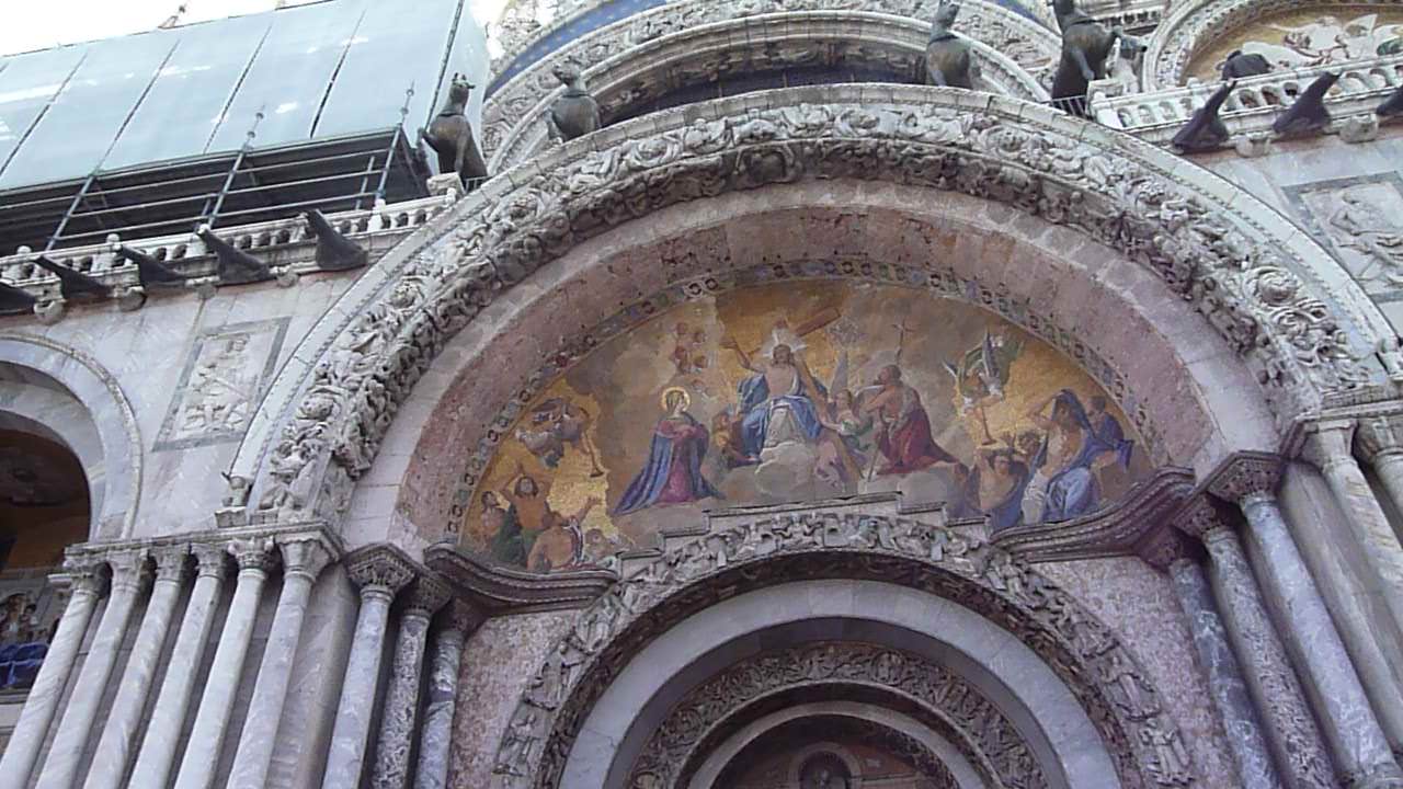 ビザンチン帝国(=東ローマ帝国)と交易し、その高度な文化を良く理解していたヴェネチア人はビザンチン様式の教会を中央広場に創建したのです。それは、着色した【ガラス小片】を使用して描くモザイク画は対塩害、対候性ともに非常に優れたものであることを熟知していたからと考えられます。特に金色に輝くモザイクはフレスコ画ではなかなか表現できない技術です。当時のビザンチン帝国(東ローマ帝国)の文化は先端を行くものであったのです。