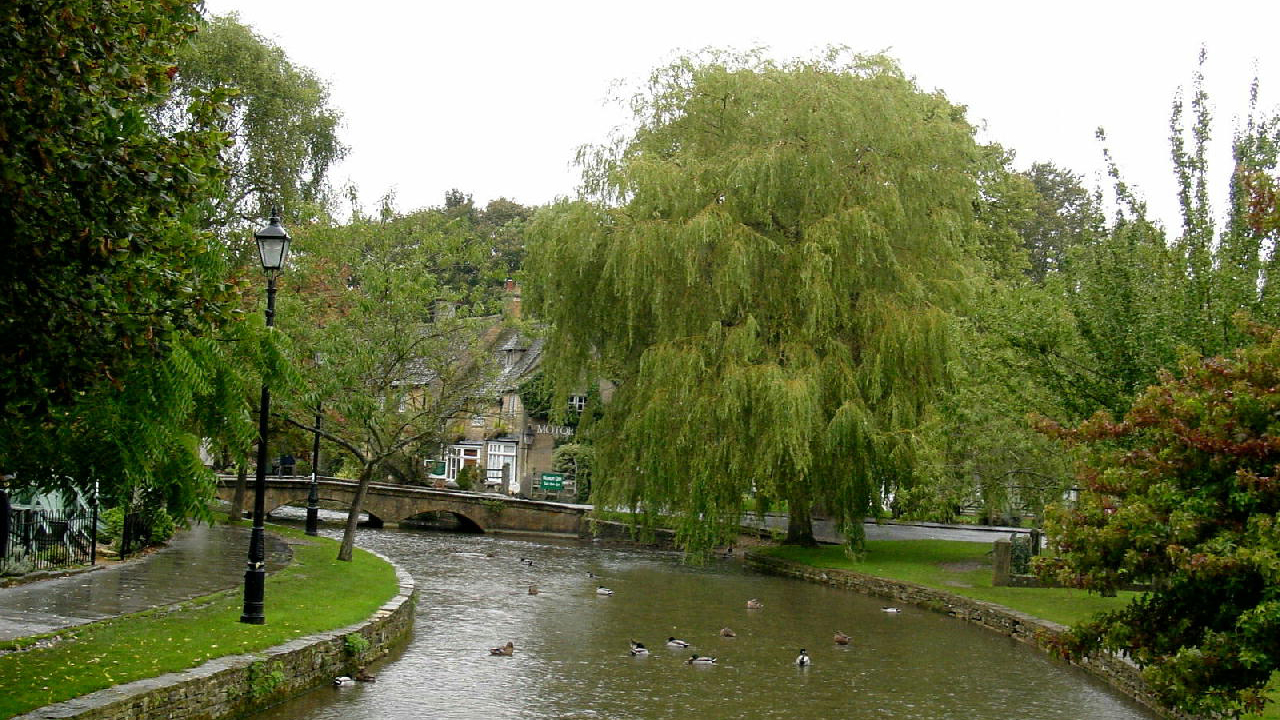 イギリス・コッツォウルズのボートン・オブ・ザ・ウォーター村の風景です。村の中央をゆったりと流れる川面にはかわいい水鳥が戯れておりました。